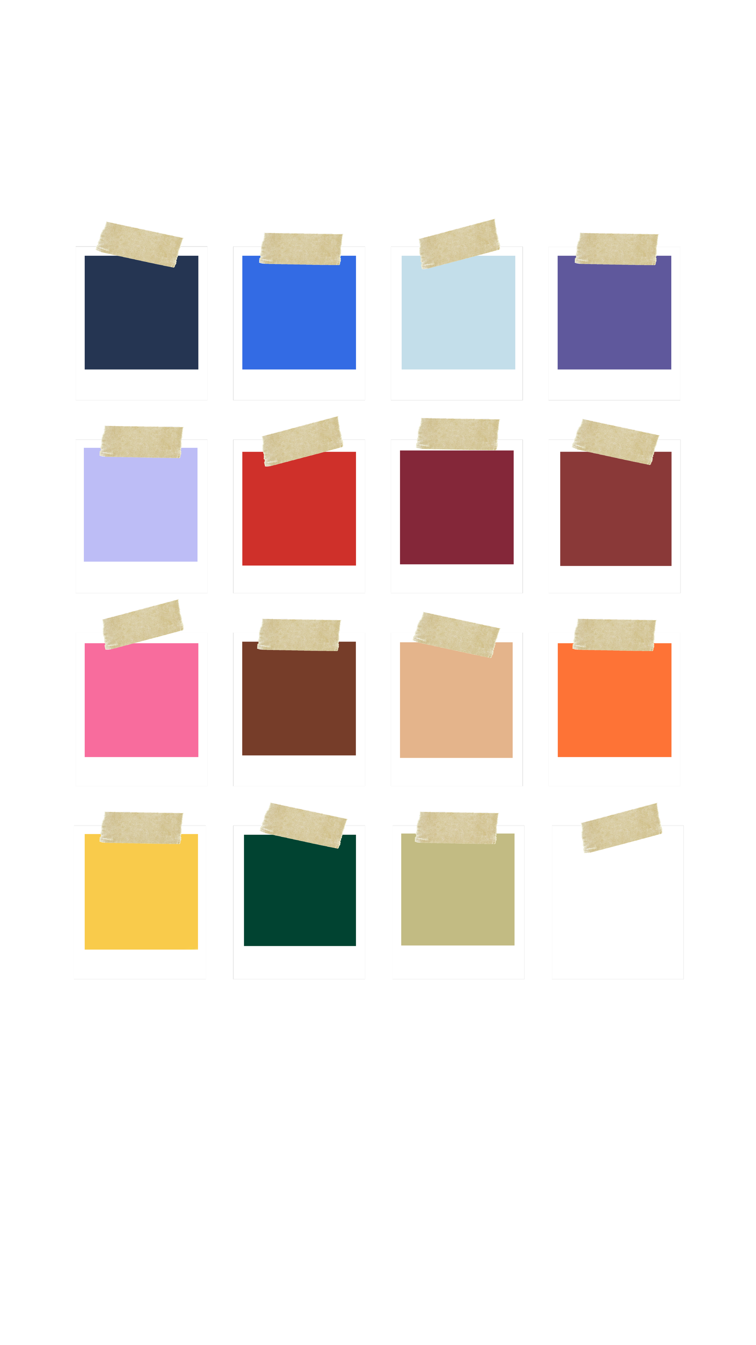 Studiotaustoja löytyy monessa sävyssä, joista voit valita mieleisesi ennen kuvaukseen saapumista. Viereisessä kuvassa näet studiotaustojen valittavissa olevia sävyjä. Huomioithan kuitenkin, että valo ja kuvien muokkaus saattaa muokata hieman sävyä viereisestä kuvasta poiketen.